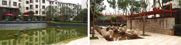 在紫荊東郡小區(qū),水景隨處可見,從主入口兩側(cè)近50米的景觀橋水景,到入口正前方一個大型的石雕噴泉,再到小區(qū)里面幾條主干道交匯的十字路口的小型地面噴泉,中心水景上的圓形石雕噴泉,特別是不遠(yuǎn)處的動物噴泉雕塑,只只鶴低頭凝思,細(xì)長的水流從鼻端的出水口處流出,落入下方的水池里,更是格外引人注目。"這些水景小品具有的藝術(shù)特性與審美效果,加強了整個景觀環(huán)境的藝術(shù)氛圍,成為讓空間環(huán)境生動起來的關(guān)鍵因素,在提高小區(qū)藝術(shù)品質(zhì)和景觀形象的同時,更給人們帶來美的享受。"楊經(jīng)理如是說。