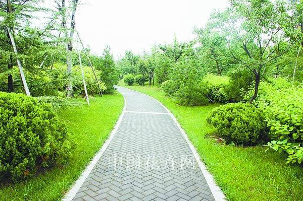 而在道路十字路口的節(jié)點(diǎn)處,則主要是用10厘米×10厘米的小花崗巖鋪地,鋪出來的路面整潔、平坦,看似簡單,實(shí)則對施工技術(shù)要求相當(dāng)高。草坪中的地面鋪裝,則采用花崗巖汀步,用錯縫鋪裝法,兩塊花崗巖之間用草皮鑲嵌,就像給每塊花崗巖鑲了一道綠邊,與旁邊的草坪和諧地融為一體。貫穿整個工程的游憩步道,全部采用“人字形”的鋪裝方法,中間用透水磚、兩邊以花崗巖鑲邊,透水磚價格不高,用以鑲邊的花崗巖是利用了鋪裝中剩余的邊料,雖然用料簡單,但通過對技術(shù)的嚴(yán)格要求,鋪出的路面整潔而不失韻味,是一種實(shí)用、環(huán)保、節(jié)約的做法。