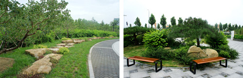 而在道路十字路口的節(jié)點處,則主要是用10cm×10cm的小花崗巖鋪地,鋪出來的路面整潔、平坦,看似簡單,實則對施工技術(shù)要求相當(dāng)高。草坪中的地面鋪裝,則采用花崗巖汀步,用錯縫鋪裝法,兩塊花崗巖之間用草皮鑲嵌,就像給每塊花崗巖鑲了一道綠邊,與旁邊的草坪和諧地融為一體。貫穿整個工程的游憩步道,全部采用“人字形”的鋪裝方法,中間用透水磚、兩邊以花崗巖鑲邊,透水磚價格不高,用以鑲邊的花崗巖是利用了鋪裝中剩余的邊料,雖然用料簡單,但通過對技術(shù)的嚴(yán)格要求,鋪出的路面卻整潔而不失韻味,是一種實用、環(huán)保、節(jié)約的做法。