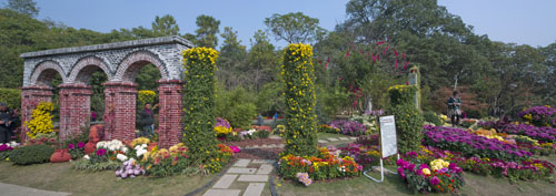 作品最大特色之處在于對原地形的充分利用及合理改造,依山勢,按水理,精細打造每一個駐步休憩之所,搭配這種菊花,或色彩,或形狀,以此營設(shè)自然而又不失韻味的菊花景觀。最后,讓人融入其中,步伐、氣息、身影混雜交錯,展示出城市生活中人們努力追求或回憶的一種起居文化,亦或是一種清凈、淡雅的“和”文化。