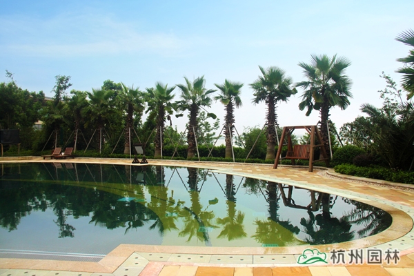 露天泳池區(qū)景觀獨(dú)具特色,選用華棕、棕櫚、布迪椰子、加拿利海棗等熱帶植物作為主景,營造出簡約大方、層次分明的濃郁熱帶園林風(fēng)情。為了提高這些熱帶植物的成活率,降低后期的養(yǎng)護(hù)成本,這批植物都經(jīng)過馴化,較能適應(yīng)吳江的氣候條件。該區(qū)面積較大,從酒店的觀景平臺上往下看,泳池中間的小島就像彎彎的小船,仿佛要順流而下;水質(zhì)清澈見底,水底大面積的藍(lán)色和黃色玻璃馬賽克,營造出波光鱗鱗的效果,偶有微風(fēng)吹來,水面蕩起陣陣漣漪,流動的線條瞬間充滿了生機(jī)和活力,整個泳池仿佛都動了起來。岸邊的植物高大茂密,郁郁蔥蔥,透過樹叢的間隙,浩渺無邊的太湖水系與遠(yuǎn)處的天際線連接在一起,恍然之間,好象是來到了充滿陽光、海浪、沙灘的南國熱帶海域,心情的舒暢不言自喻。