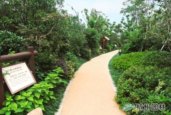 五千年的中國歷史文化,恢宏浩瀚,為園林造景提供了取之不竭的素材;園林景觀,也因?yàn)閭鞒辛松詈竦奈幕滋N(yùn)而散發(fā)出獨(dú)特的藝術(shù)魅力。作為一個旅游度假項(xiàng)目,對園林景觀的要求,不僅僅只是精致大氣、風(fēng)韻天成的美景,更需要有深厚的文化底蘊(yùn),彰顯獨(dú)一無二的中國元素。為此,在2號樓大廳門前,用植物造景再現(xiàn)代表中國書法中筆畫大體的“永”字八法,彰顯中國書法的魅力;在泡池的建造上,運(yùn)用老石碾、壓門石、老磨盤等老石材,打造出懷舊氣息濃郁的鄉(xiāng)土風(fēng)情。