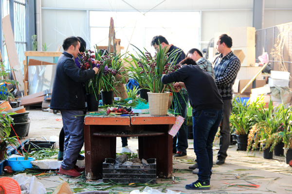 員工組盆現(xiàn)場(chǎng):一盆盆精美的花卉從他們手中誕生