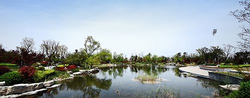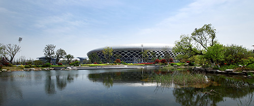據(jù)夏修智介紹,奧體公園是工程的主要景觀節(jié)點,位于奧體中心西北側(cè),面積約5萬平方米,是一座集娛樂、運(yùn)動為一體的特色濱水運(yùn)動公園,也是整個奧體中心的“綠肺”。一條蜿蜒的河流將公園劃分為東部運(yùn)動區(qū)和西部休閑公園區(qū)。運(yùn)動區(qū)緊挨訓(xùn)練中心,東側(cè)便是足球場、籃球場和排球場,運(yùn)動后就能感受到融入大自然的清新;休閑公園區(qū)包括入口廣場、樹陣廣場、以及河水匯聚而成的小人工湖,湖邊蘆葦迎風(fēng)擺動,湖水清澈見底,鵝卵石鋪就的湖底清晰可見。整個奧體公園以中國古典園林為主、回歸自然的組團(tuán)式造景手法,強(qiáng)調(diào)休閑、幽靜、生態(tài)自然。從西入口廣場的草坡,逐漸過渡到觀賞性強(qiáng)的觀花、觀葉園林樹種,配合灌木、草木、地被形成人為景觀,從西到東植物次第減少,層次不斷變化,形成了從自然生態(tài)狀綠化到人工幾何狀綠化的逐漸過渡,讓自然的活力與體育精神融為一體。