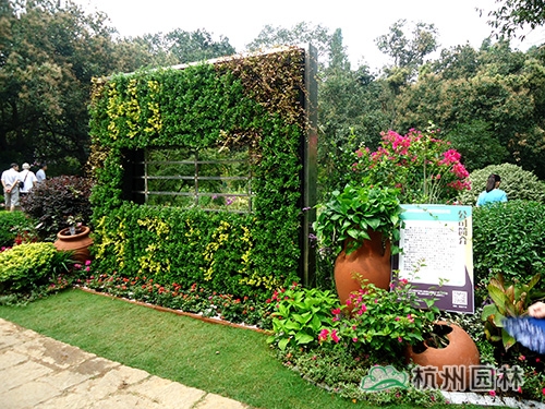 走進畫境園,只見主入口左側(cè)種植著兩株一高一矮的厚皮香樹,郭昌如笑著說,“這兩棵厚皮香寓意的是兩個萬分自豪的森林衛(wèi)士——熊大和熊二,你看,熊二還滿臉熱情地向游人不停地招手示意呢?!敝魅肟谟覀?cè)是一面立體綠植墻,所用的植物主要為黃金絡石、金寶石冬青、小葉梔子花、金邊黃楊等?!傲Ⅲw綠植墻是立體綠化的主要形式,畫境?青山湖花園中心推出的這款立體綠植墻產(chǎn)品,可以根據(jù)客戶需要,結(jié)合氣候、溫度、濕度、色彩等綜合條件,選配四季長綠或色彩豐富的植物,隨時在人們想要的地方構建出一個貼近自然又超脫自然的生活環(huán)境,可謂是簡單又方便。”郭昌如介紹道。立體綠墻的兩側(cè),隨意地散落著一些紅陶罐,與金寶石冬青、龜甲冬青等精品球形植物,三角梅、月季、常春花、雞冠花等花卉,紫葉狼尾草、晨光芒、矮蒲葦?shù)扔^賞草混搭,營造出一種溫暖、和煦的庭院景觀?!叭绻丫G植墻看成是城市的建筑,此景則喻意美麗杭城的繁華一角?!惫缪a充說。綠植墻的中間還別出心裁地設置了一扇窗戶,透過它,園內(nèi)的美景已隱約可見。