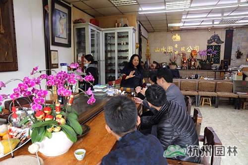山水園林景觀公司的楊枚良女士有多年的櫻花引種、繁育、栽培、應(yīng)用經(jīng)驗(yàn),在臺灣業(yè)內(nèi)素有“櫻花女王”之稱??疾炱陂g,考察人員特地前往山水園景觀公司拜訪楊枚良女士,交流櫻花引種、生產(chǎn)、栽培經(jīng)驗(yàn),并前往山水園林景觀公司的櫻花苗圃基地參觀,實(shí)地考察臺灣地區(qū)主要栽培櫻花品種的生產(chǎn)、栽培情況。