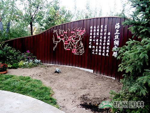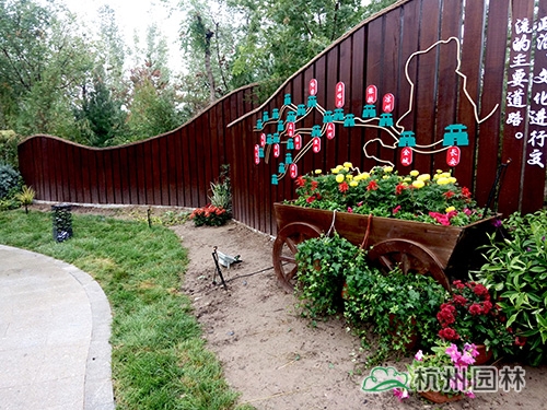 本處已有木制景墻做背景,花境施工前已在幾個節(jié)點放置了花車、木桶等,并栽植了一棵較高大的紅皮云杉,為花境營造創(chuàng)造了良好的條件。結合景墻上的文字、地圖,以“陸上絲綢之路”文字為分界點,營造“絲?路”、“絲?念”兩組花境。
