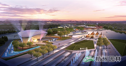渡航廣場(chǎng):鉆石形狀的綠坡結(jié)合船型夾板造型,寓意破浪前行的渡船,象征肥西人民開拓進(jìn)取的時(shí)代精神。