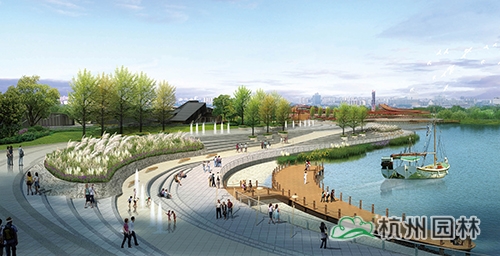 水岸廣場(chǎng):臺(tái)地張弛有度,將臺(tái)階、坡道、草坪、木平臺(tái)、廣場(chǎng)組成豐富的濱水空間,流線型的岸線貫穿整個(gè)臺(tái)地,形成一條觀光濱水走廊,結(jié)合濱水岸線設(shè)置游船碼頭、親水平臺(tái),形成極具特色的水岸廣場(chǎng)。