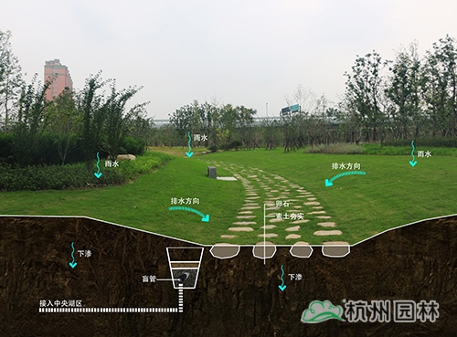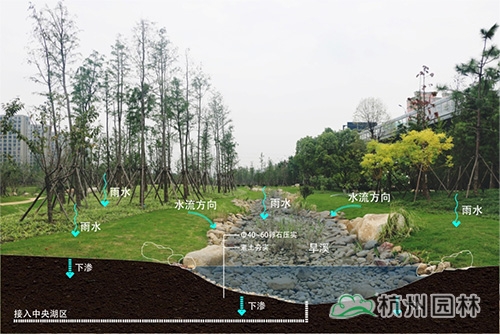 旱溪布置于帶狀綠地低洼處。設(shè)計(jì)時(shí)仿造自然界中干涸的河床,配合濕生植物的營(yíng)造,在意境上表達(dá)出溪水的景觀。降雨時(shí)可減緩地表徑流,起到緩排作用。旱溪底部接盲管,將水導(dǎo)入中央湖區(qū),進(jìn)行儲(chǔ)存。