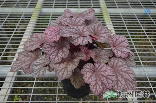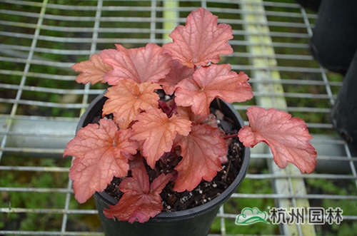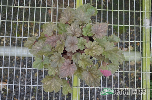 礬根又名小花腎形草,英文名為“Alum root”(因根部不規(guī)則膨脹而來),因此在引入中國的時(shí)候被翻譯成了“礬根”。礬根葉色繁多,且葉色會(huì)隨著季節(jié)、環(huán)境、溫度和光照條件的變化而改變。例如,‘蜜桃黃’在春天的時(shí)候,葉子展現(xiàn)出細(xì)膩的銀色光澤,成熟的葉片顏色會(huì)呈現(xiàn)紫色并略帶玫瑰紅;‘赤砂巖紅’的葉色會(huì)從桃紅色變?yōu)榱零~黃色,再變?yōu)榫G色帶有琥珀色;‘貴族紫’葉子的顏色會(huì)保持穩(wěn)定的紫色,冬天的葉子會(huì)變成銀色。