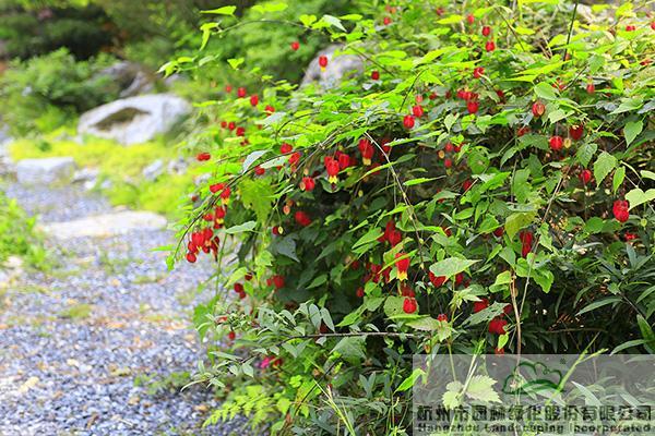 紅萼苘麻的花朵就像一個(gè)個(gè)紅燈籠,使原本沉悶的石頭充滿了自然的野趣。