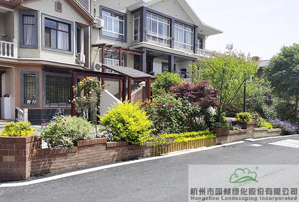 梅秋里的房屋多為兩到三層建筑,但建筑風(fēng)格、外墻立面均有區(qū)別,因此,在進(jìn)行景墻施工時(shí),根據(jù)每家的房屋建筑特色選擇了不同的材料和植物配置手法。比如,建筑外立面為紅色的,景墻以紅色磚為主,搭配月季、佛甲草等植物;建筑外立面為灰色的,景墻以淺黃色磚為主,結(jié)合小木樁或仿竹籬笆,搭配石竹、美女櫻等植物;建筑外立面有大理石點(diǎn)綴的,景墻以桐廬石為主,輔以裝飾過的輪胎,點(diǎn)綴佛甲草、常春藤等植物。不同的處理手法,使得家家戶戶的景墻既有連續(xù)性,又有各自的風(fēng)格。