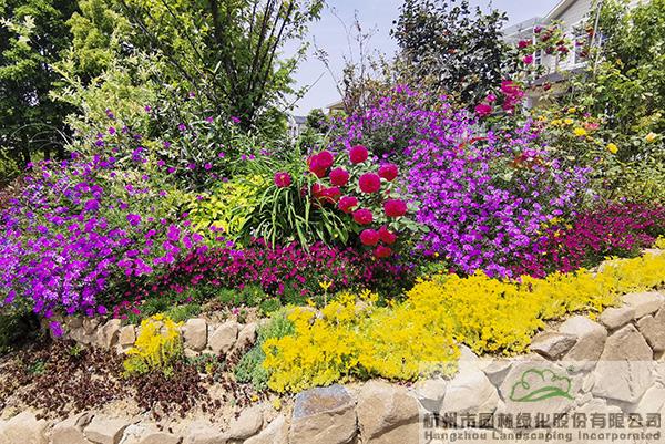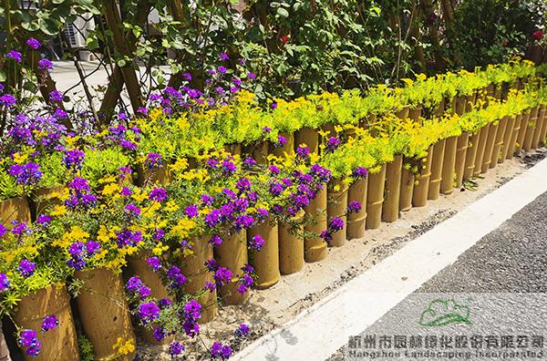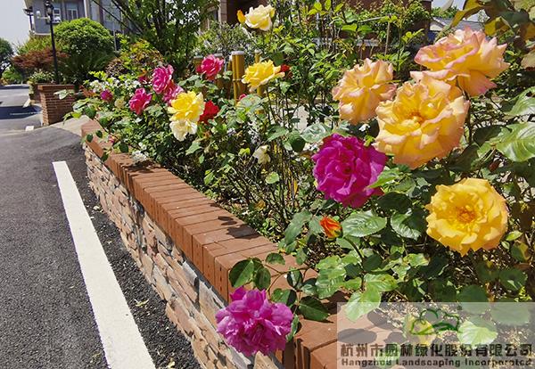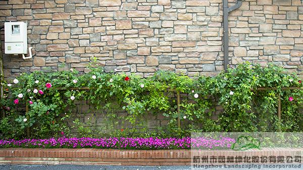 景墻邊的植物配置同樣有講究。利用銀杏、桂花、梅花、紅楓等植物營造上層空間,這些植物具有遮擋作用,能夠?yàn)橥ピ籂I造一定的私密空間。通過樹狀、球狀、攀援、傘狀、字母等各種形態(tài)的月季,金冠女貞球、龜甲冬青球、銀姬小蠟球、藍(lán)莓、八仙花、小葉梔子、翠蘆莉、花葉千鳥花、藍(lán)山鼠尾草、紫葉狼尾草等小喬灌木,在打造中層空間的同時(shí),和美女櫻、金娃娃萱草、花葉玉蟬花、花葉香桃木、紫菀、澤蘭、礬根、五彩絡(luò)石、石竹等下層空間植物一起,裝飾和襯托景墻,使家家戶戶的景觀更加豐富多變。