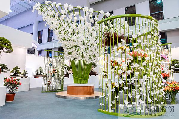 走進(jìn)館內(nèi),各種浙江特色新優(yōu)園林園藝植物產(chǎn)品、花藝作品、盆景作品等,讓人忍不住駐足停留。最引人注目的,則是以一朵朵白色的蝴蝶蘭花朵與仿竹構(gòu)筑物營(yíng)造的立體景觀,結(jié)合蒼翠欲滴的竹林背景和浙派山水盆景,營(yíng)造出綠意盎然、生機(jī)無(wú)限的風(fēng)景畫(huà)卷。寓意浙江是“綠水青山就是金山銀山”理論的發(fā)源地,表現(xiàn)浙江始終踐行“綠水青山就是金山銀山”的理念、大力推進(jìn)生態(tài)文明建設(shè)取得的巨大成就。