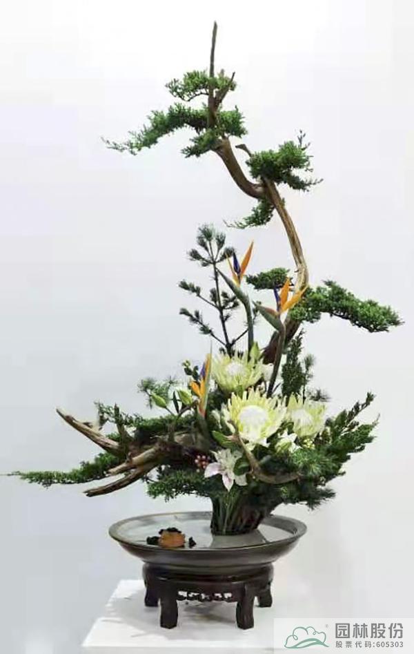 另有極富意境的《云崖青嶠》插花作品,選崖柏、龍柏、鋪地柏、五針?biāo)?、帝皇花、重瓣百合花、粉色和白色金絲桃、天堂鳥(niǎo),以成云崖青嶠之作。云為雅意,崖寓故訓(xùn),青色入觀,嶠在畫(huà)外。如此,松風(fēng)若過(guò),花開(kāi)舒卷,青紅果結(jié),臨水照影。清澗之曲,碧松之陰,相映成趣,著手成春矣。