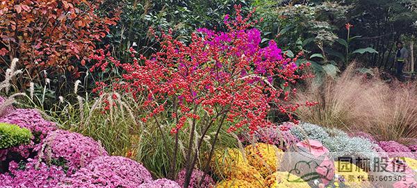 一種是未落葉的北美冬青,紅果掩映在綠色葉片中,活潑可愛。球菊和蟹爪菊都是球狀,自然舒展形態(tài)的北美冬青打破了該處單調(diào)的格局,同時也在高度上進(jìn)行了過渡。