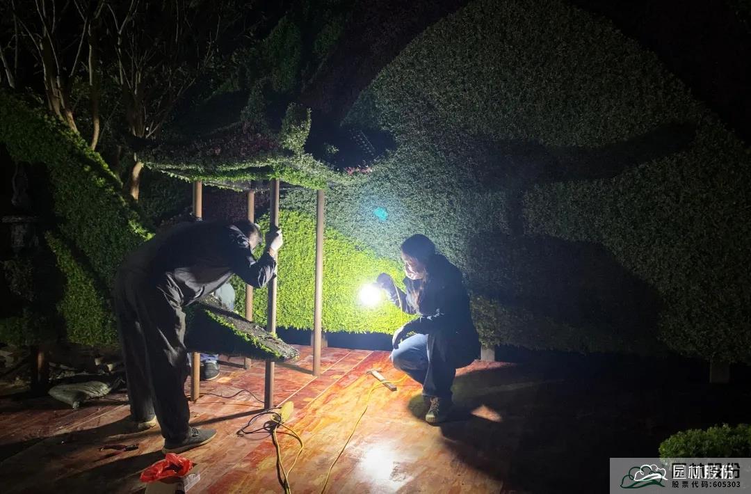 為不影響施工進(jìn)度,對(duì)綠雕局部拆卸后移至指定位置,并按要求二次拼裝。而拼裝后的綠雕,部分作業(yè)面變窄,給插草工作帶來(lái)了較大不便。