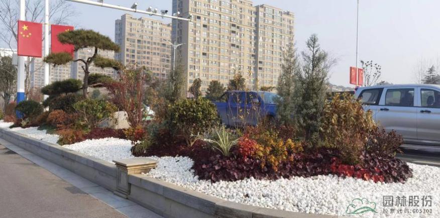 江山大道與黃山路、黃浦江路與項王路路口的植物配置,采用群落結構、組團配置和盆景化的自然式造園手法,在空間、色彩、節(jié)奏方面獨具匠心,打造了高低錯落、疏密有致的和諧景觀。考慮到行車安全性與視線誘導因素,中央綠化隔離帶以黑松樁的種植片段和花鏡+球類的自然群落片段進行循環(huán),打造規(guī)則中有自然的效果。機非綠化隔離帶以黑松樁+花鏡種植,打造艷麗的春景效果。