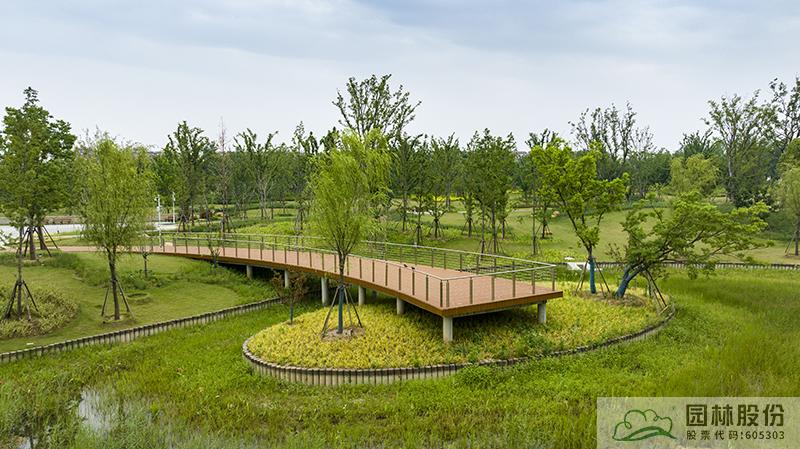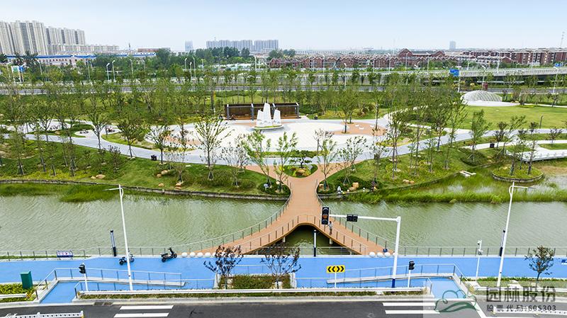 水系貫穿整段綠地,綠道、景觀橋穿插其中,沿途設(shè)置平臺、廊架等,充分呼應(yīng)水網(wǎng)與路網(wǎng)交織主題。水系駁岸既有草坡入水,又有仿木樁駁岸,點綴景石,搭配疏密相間的綠化,共同形成了生態(tài)多樣的生態(tài)水岸。